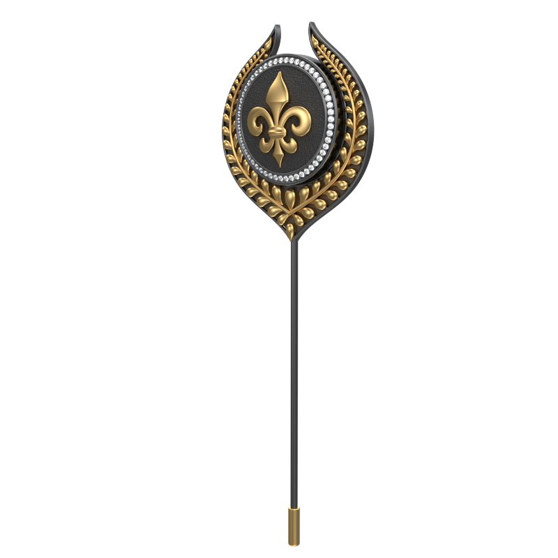 Fleur di lis Luxe, Leaf Spiritual Lapel with CZ Diamonds, 18kt Gold & Black Ruthenium Plating on Brass.