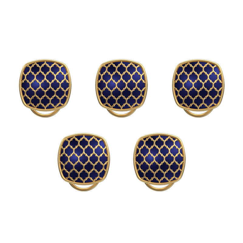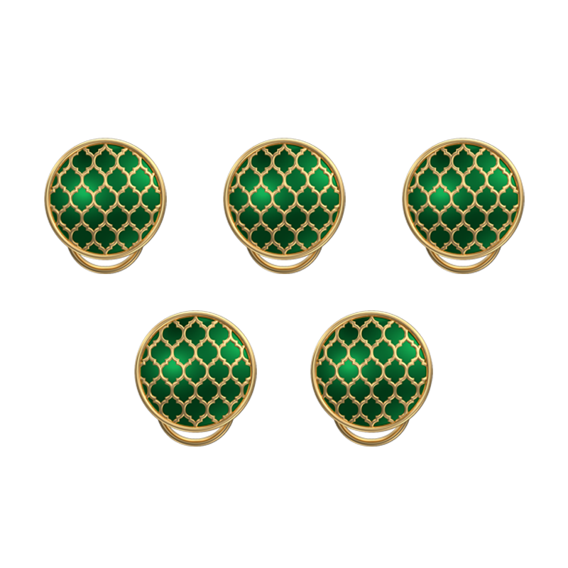 This design is inspired by Persian era architecture exuding Royalty. This Handcrafted Classic Button Set comes with 18kt Gold Plating and Enamel. Add flair and wear them on your Sherwanis, Achkans & Bandhgalas.