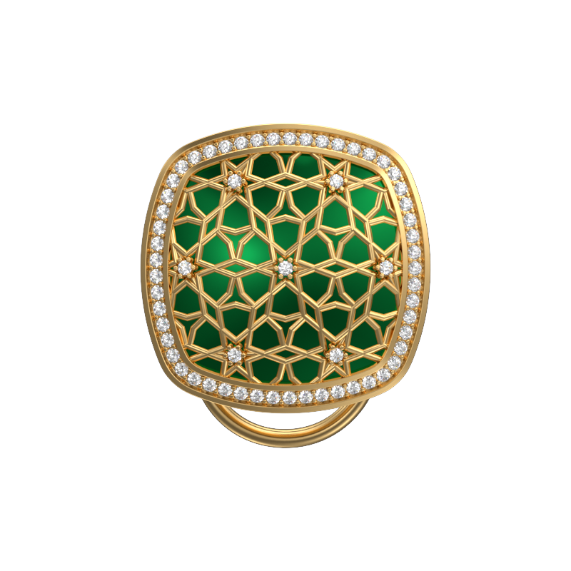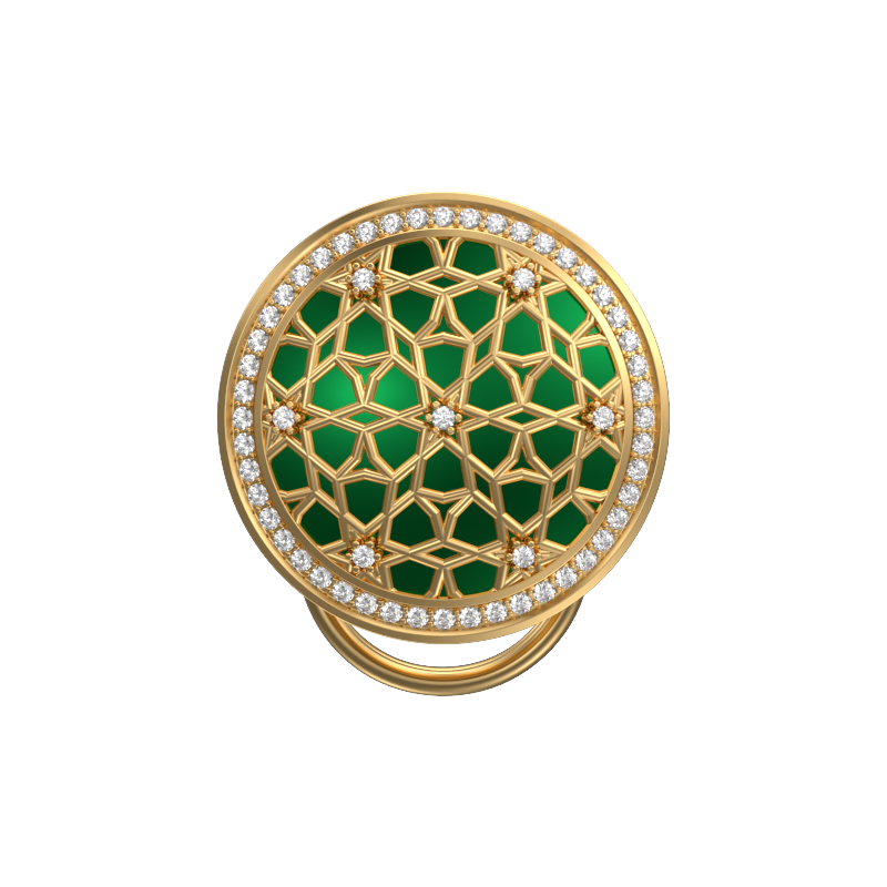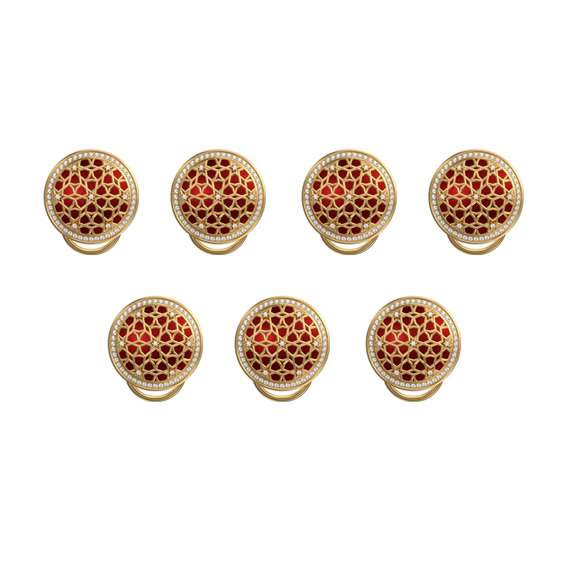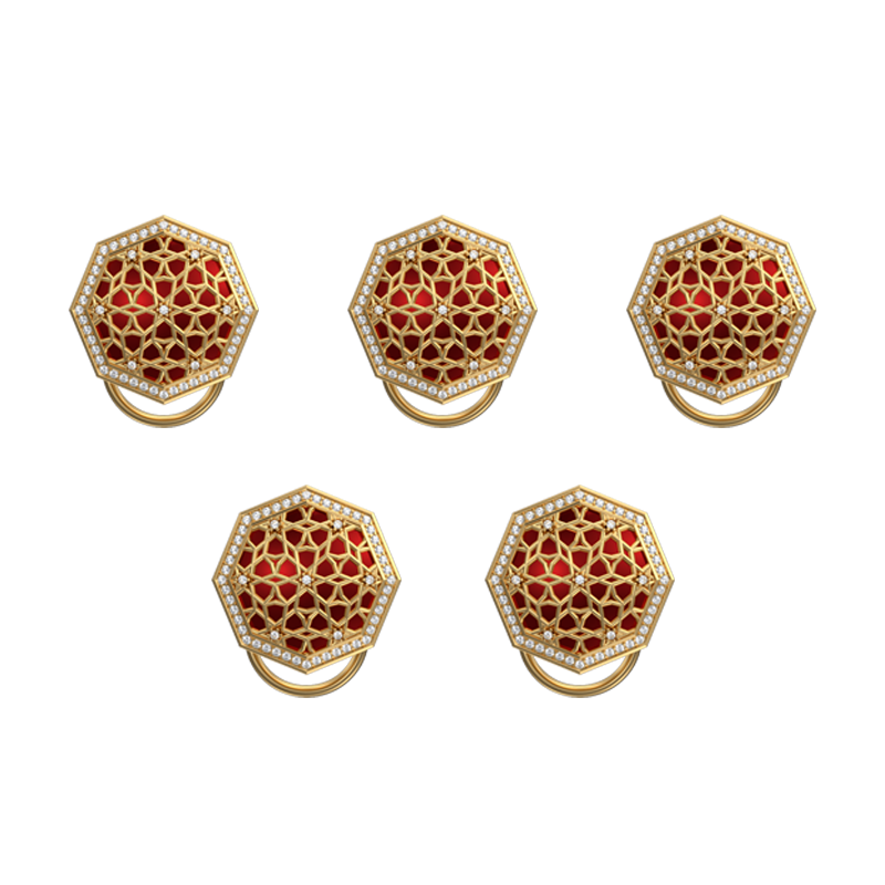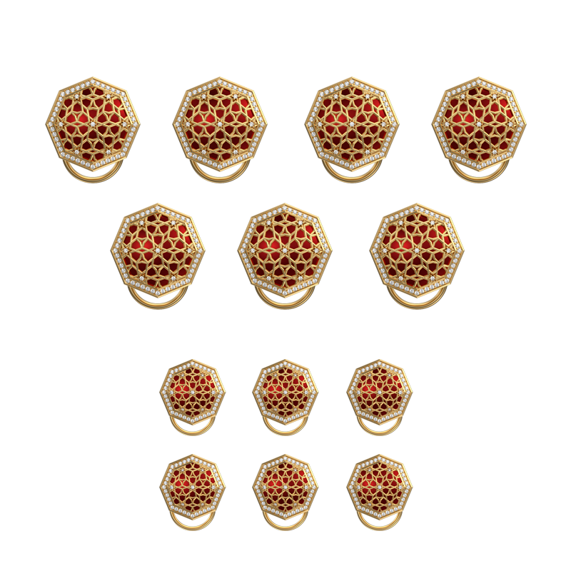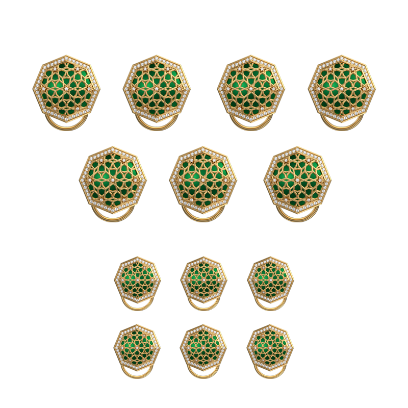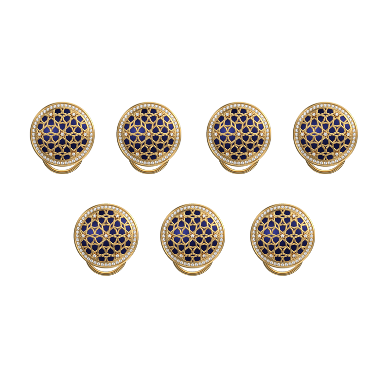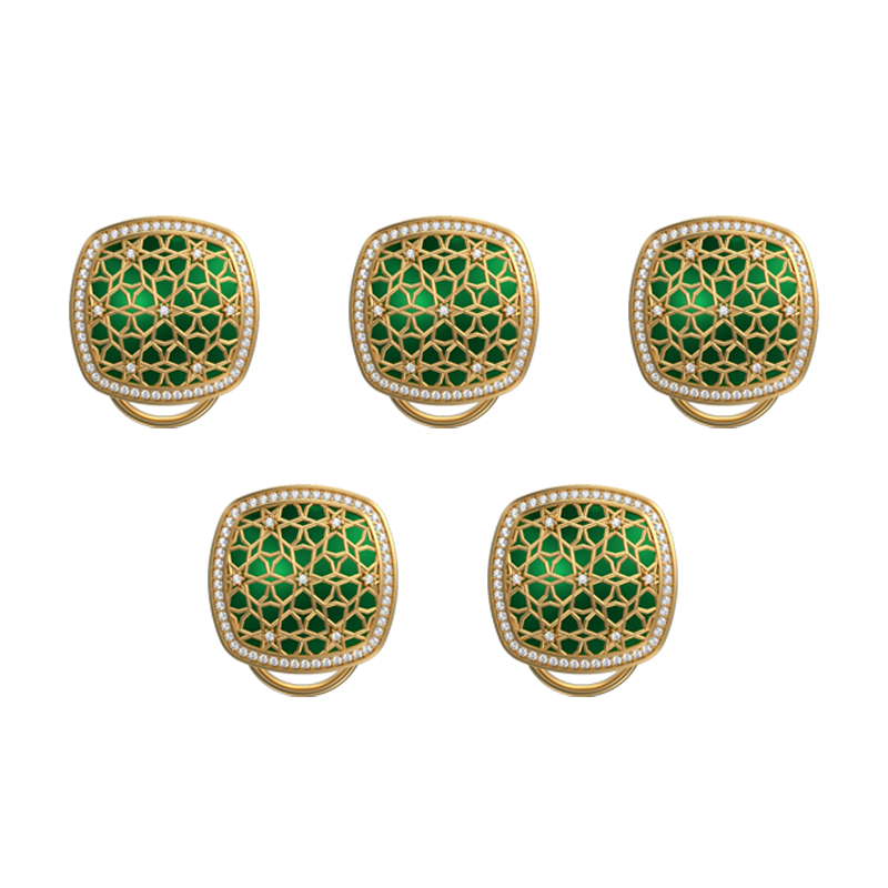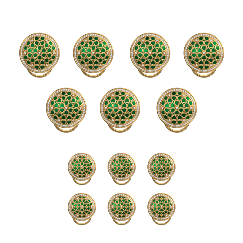 This design is inspired by Persian era architecture exuding Royalty. This Handcrafted Classic Button Set comes with 18kt Gold Plating, Enamel and studded with CZ Diamonds. Add flair and wear them on your Sherwanis, Achkans & Bandhgalas.